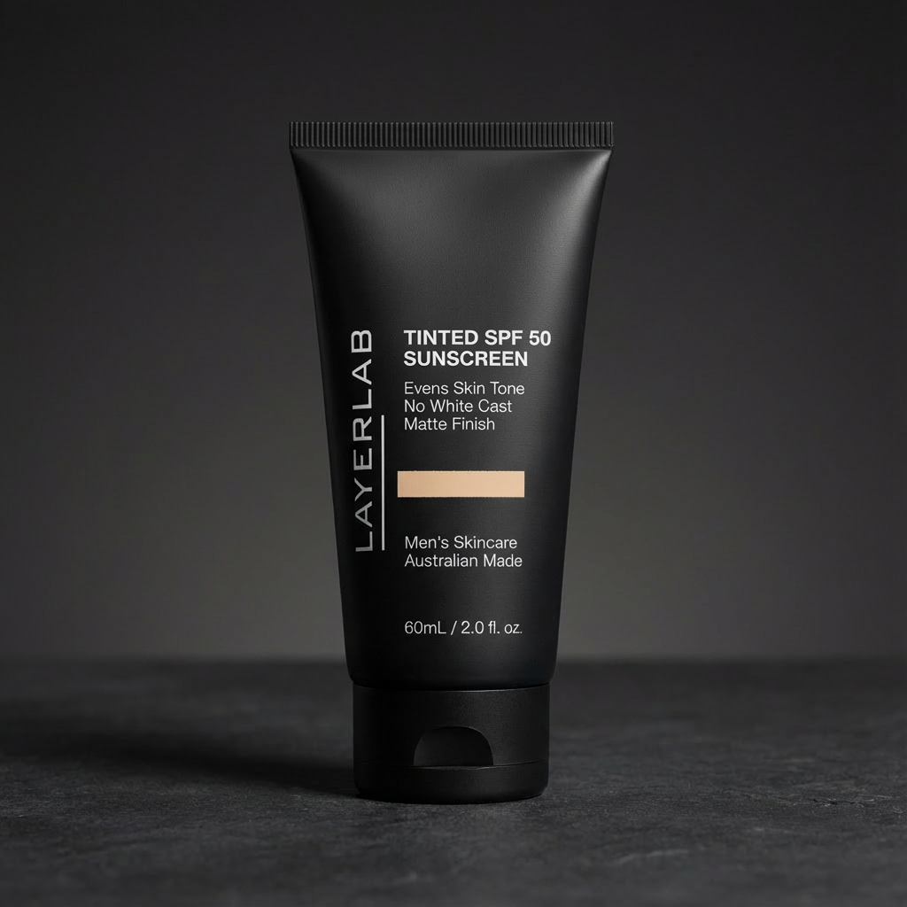 LayerLab Tinted SPF 50 sunscreen is a fast, undetectable way for men to fix uneven tone, redness, acne, acne scars and dull-looking skin in one step.
